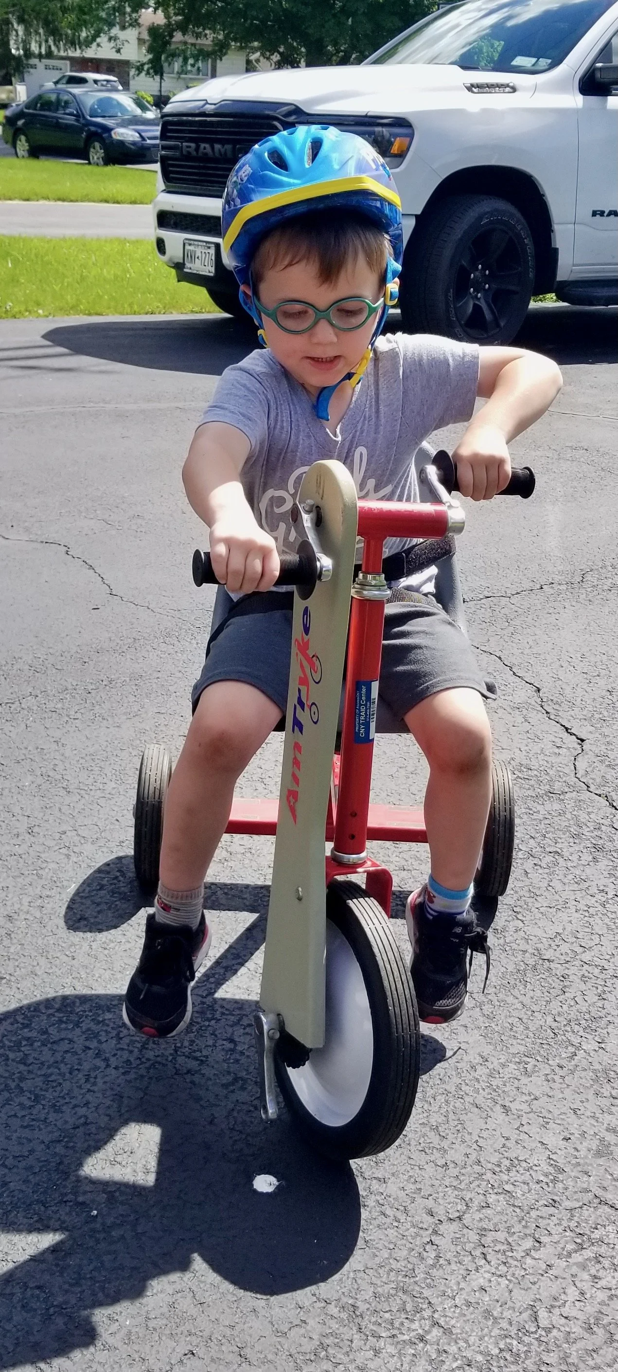 Currently six years old, Avery uses an Augmentative and Alternative Communication (AAC) device and a significant amount of American Sign Language (ASL) to communicate. For ambulation, he relies on a walker and a drop-support harness while at school and when navigating unfamiliar environments. He sleeps in a safety bed and rides an adaptive tricycle.