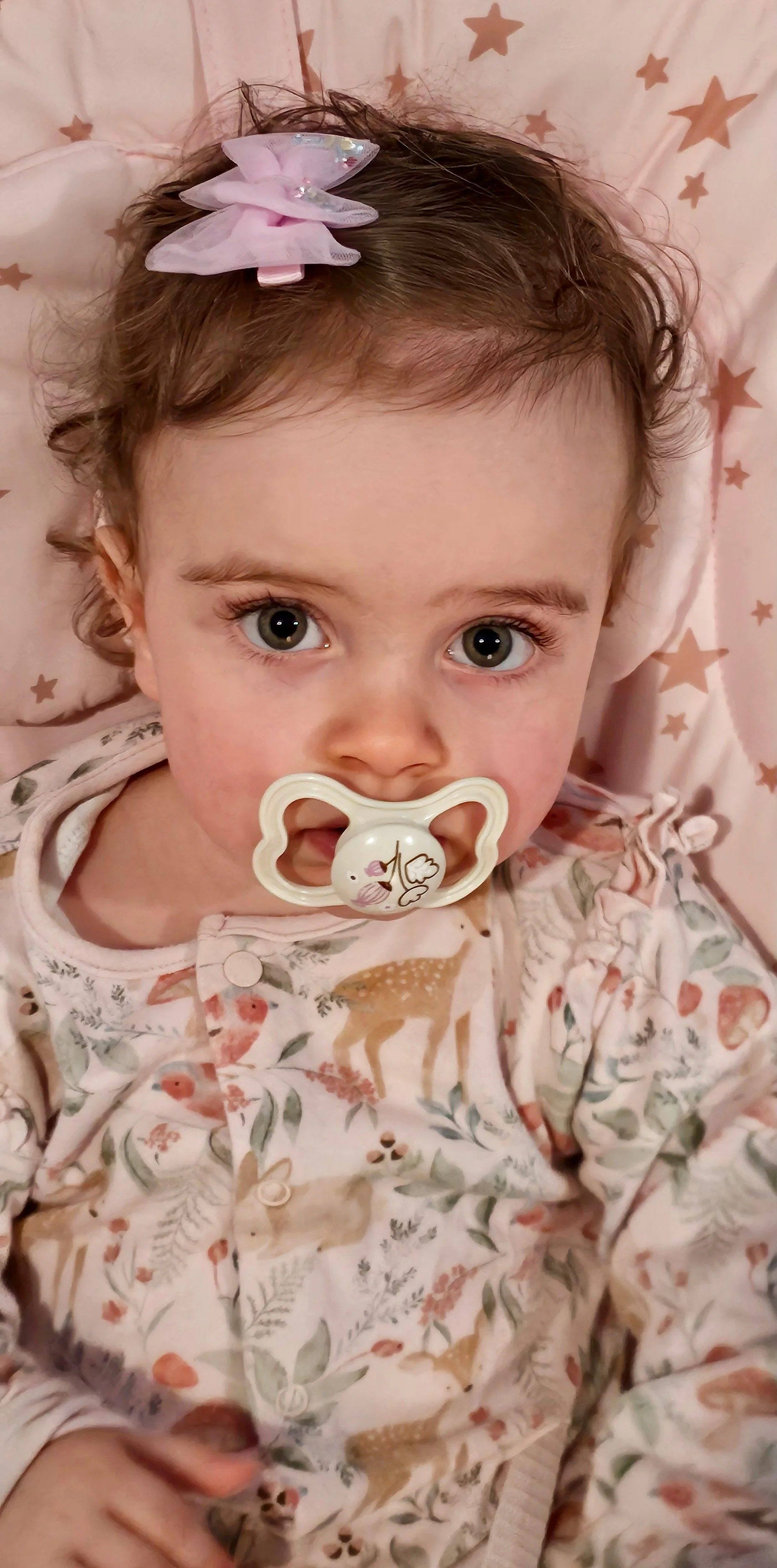 Evelyn is currently 15 months old and lives in the UK. Evelyn’s mother, Claire, writes that Evelyn’s such a happy baby who loves cuddles and kisses and, most importantly, Daniel Tiger. No one makes her smile more than he does! Her perseverance is her greatest strength. Evelyn tries hard all of the time. She always does her best with her physio, eats well, and can feed herself milk through a sippy cup. She enjoys her food and tummy time! She likes playing with her brother and sister. Her older sister makes her laugh a lot!