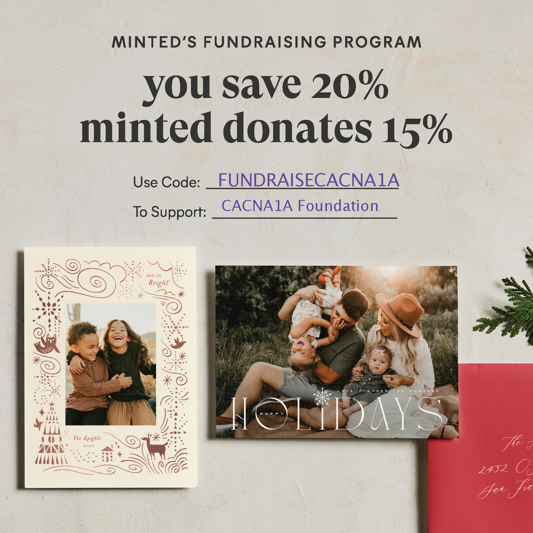 Holiday cards, stationery, gifts, calendars, items for your home….Are you ready to do some shopping? We’ve partnered with Minted to help us fundraise. Shop minted.com using promo code FUNDRAISECACNA1A. You’ll save 20% and minted will give 15% back to the CACNA1A Foundation. It’s a win-win!