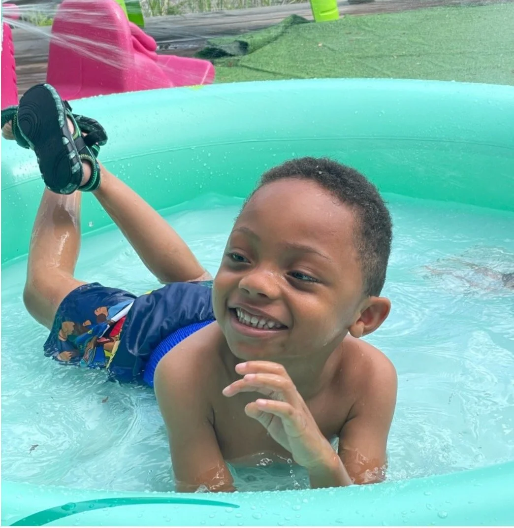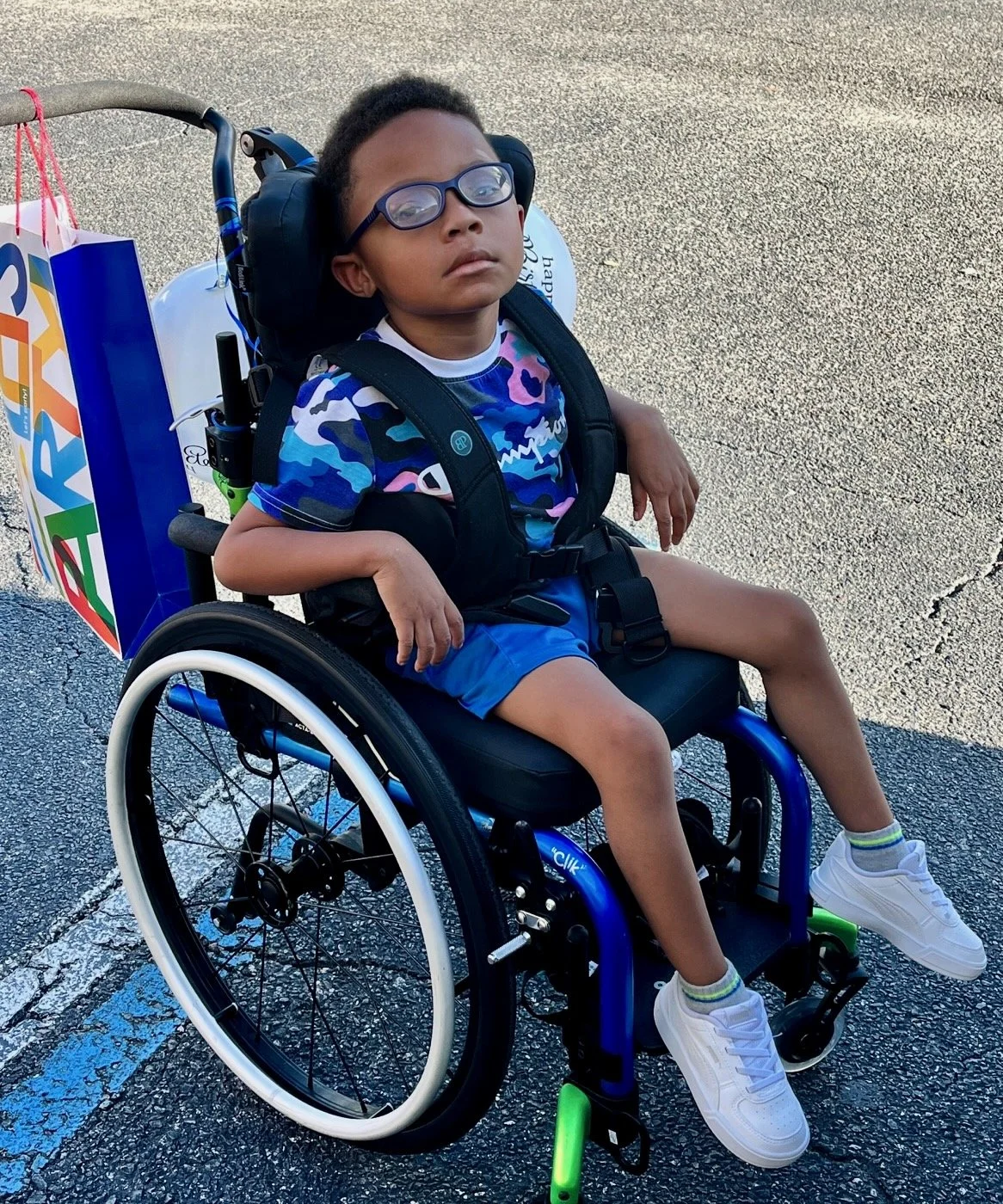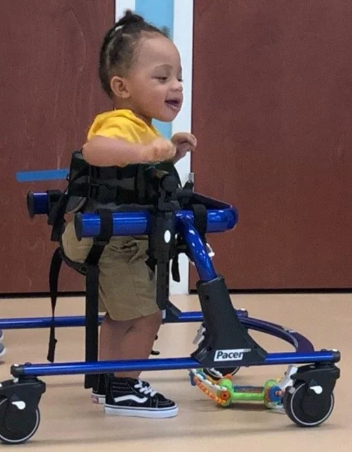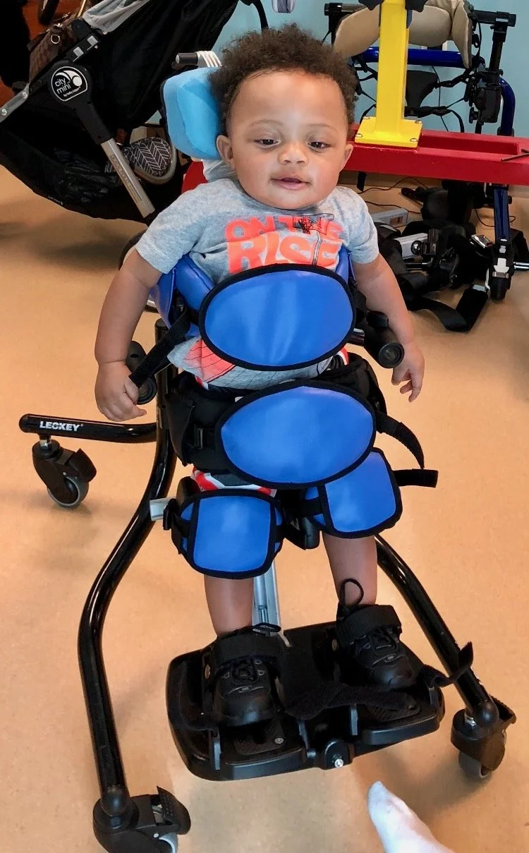 Kyrie was born in 2017 in Jacksonville, FL, and is 5 years old. He is very social and playful and loves to babble. Kyrie has not yet learned how to sit, stand, or walk independently. However, he has great leg strength and loves to stand up with assistance.